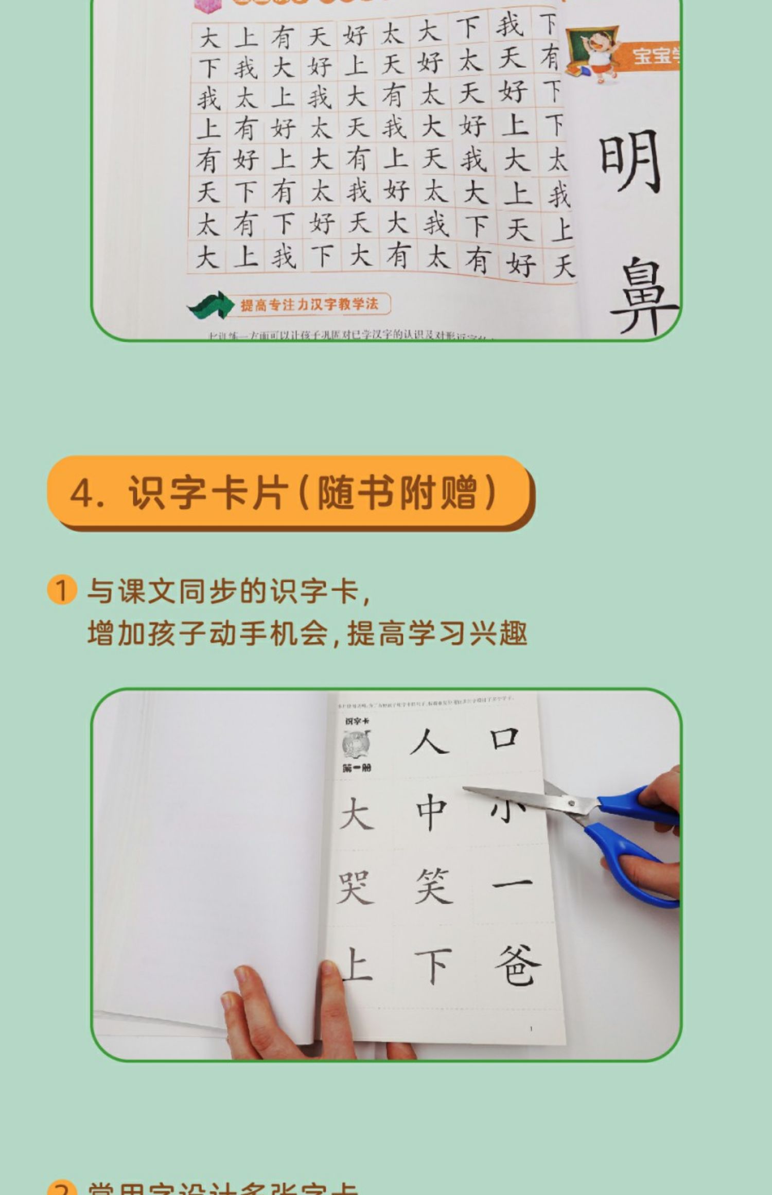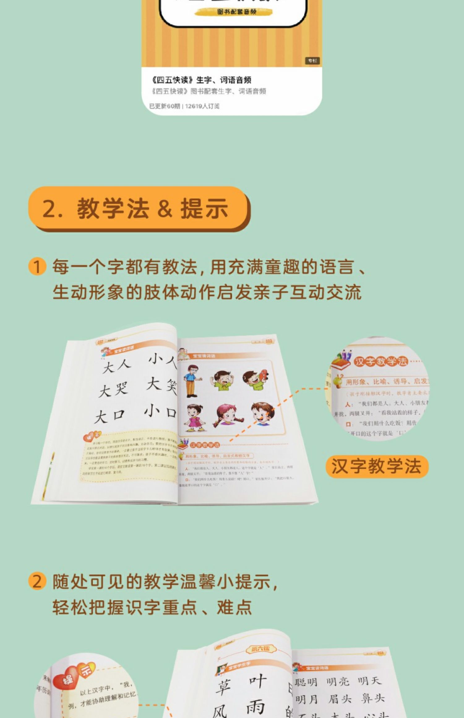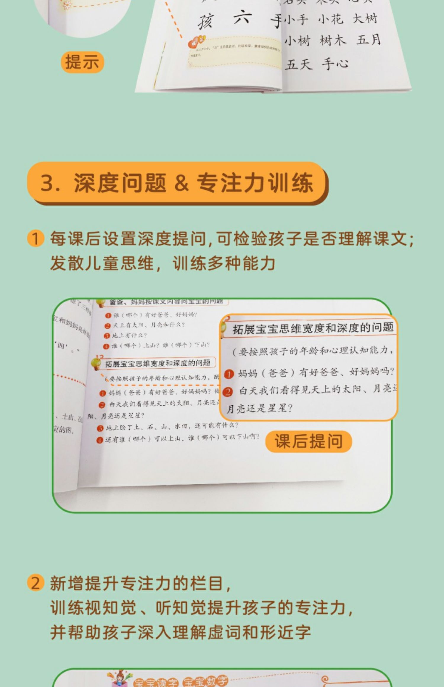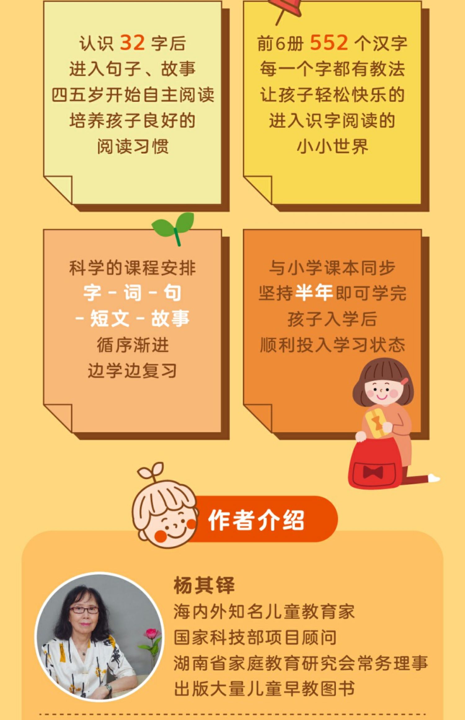 教材采用循序渐进的教学理念,从16个基础汉字逐步扩展到词组、短句及长篇阅读,共分六册,涵盖近千个汉字与4000余个词语,内容编排与小学课本同步。书中运用形象比喻、字族教学等方法引导思考,每课后设有启发性提问强化记忆,并融入虚词、形近字等专项训练。通过亲子朗读与游戏化复习结合的方式,强调在兴趣引导下建立识字习惯,旨在使学龄前儿童初步具备报刊阅读能力,为入学后的学习奠定基础。